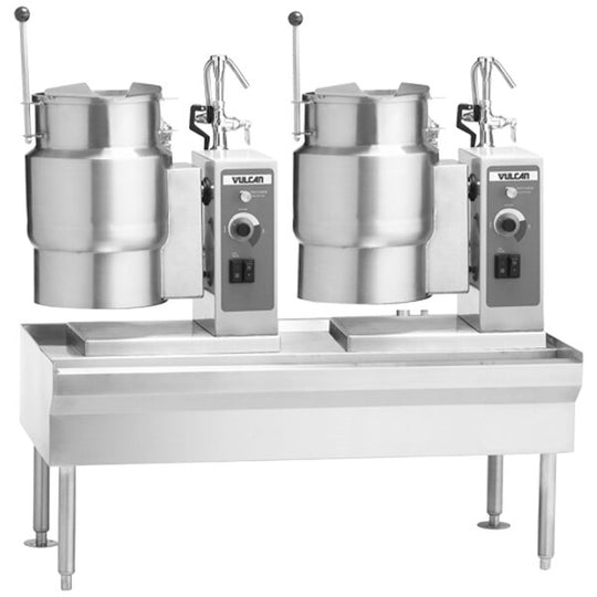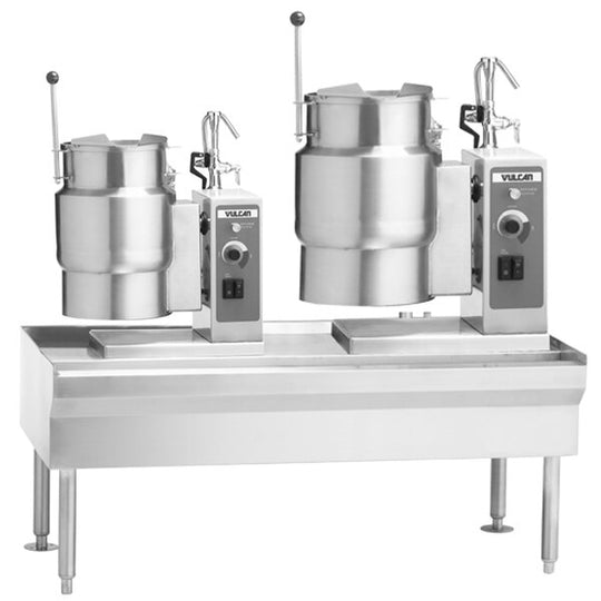 Kettle/Stand Assembly, (2) K6ETT electric tilting kettles, 50" wide stand, full length drain trough, dual temperature, stainless steel table top, drain trough, sides, back, legs with flanged feet, ULRegular price $30,305.00Regular price $30,305.00 -