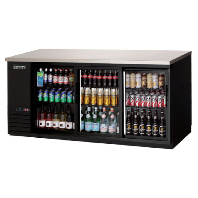 Everest Refrigeration EBB90G-SD 89 Inch Back Bar Refrigerator Three-section Stainless Steel Top Glass Door Black Exterior