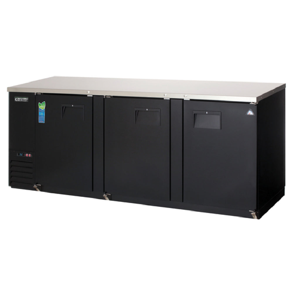 Everest Refrigeration, EBB90-24, Back Bar Refrigerator, three-section, 89-1/4"W, 28.0 cu. ft. capacity, (980) 12 oz. can or (609) 12 oz. bottle capacity, self-contained side mounted refrigeration, stainless steel countertop, (3) solid hinged doors (locking), (6) epoxy coated wire shelves, digital controls with LED display, auto defrost, LED interior lighting with on/off switch, textured & laminated black vinyl exterior, galvanized steel interior wall & stainless steel floor, R290 Hydrocarbon refrigerant, 1/3 HP, 115v/60/1-ph, 2.5 amps, cord, NEMA 5-15P, NSF, cETLus, ETL-Sanitation