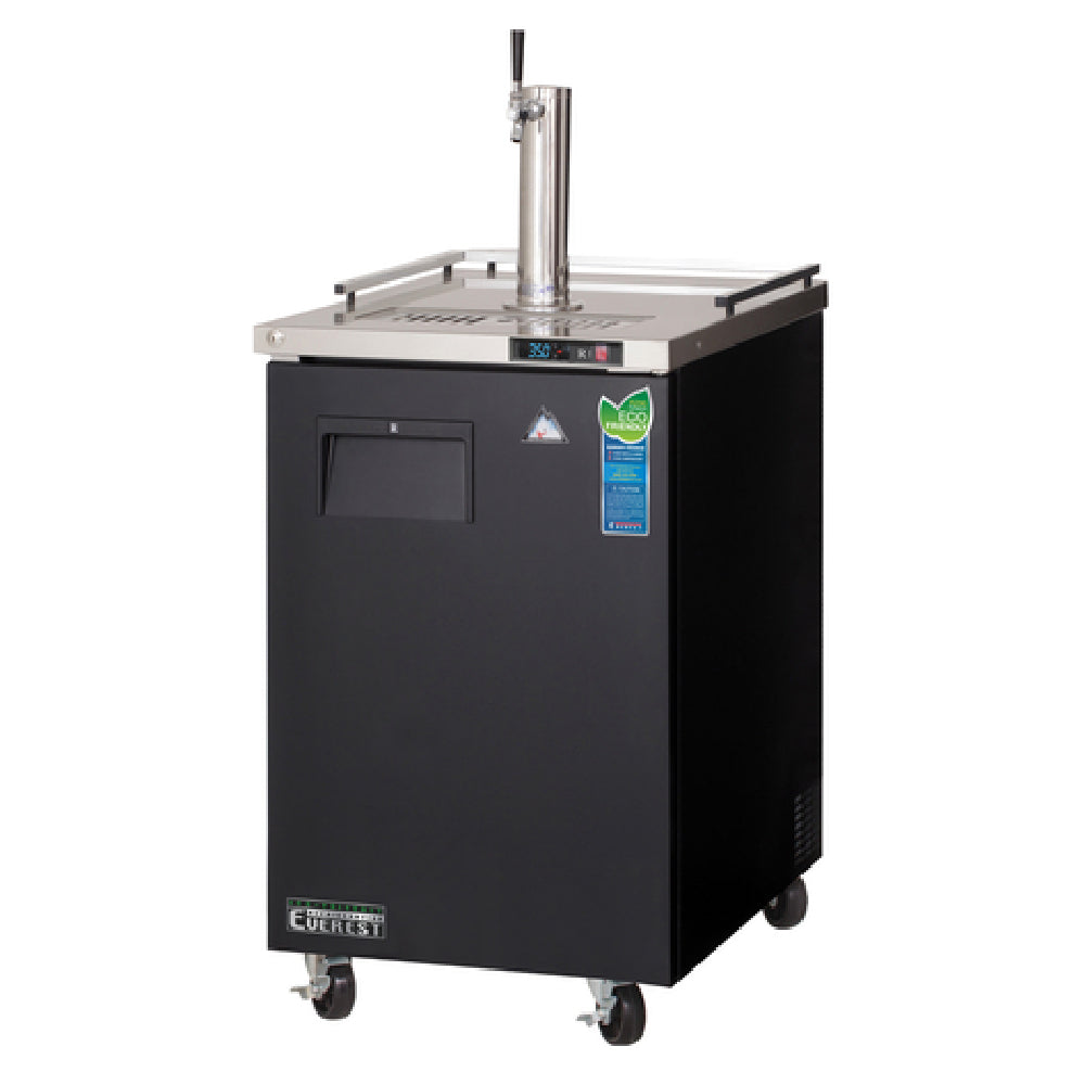 Everest Refrigeration, EBD1, Direct Draw Keg Refrigerator, one-section, 23-1/2"W, 8.0 cu. ft. capacity, self-contained side mounted refrigeration, (1) solid hinged door (locking), holds (1) 1/2 barrel keg, (1) 3" diameter insulated stainless steel draft tower (NSF) with air distributor, (1) single faucet, stainless steel countertop & rail, digital controls with LED display, auto defrost, LED interior lighting, textured & laminated black vinyl exterior, galvanized steel interior wall & stainless steel floor, exterior drain port for excess top tray moisture, drain hose not included, floor drain required, (4) 5" swivel casters (2 locking), R290 Hydrocarbon refrigerant, 1/5 HP, 115v/60/1-ph, 2.5 amps, cord, NEMA 5-15P, NSF, cETLus, ETL-Sanitation