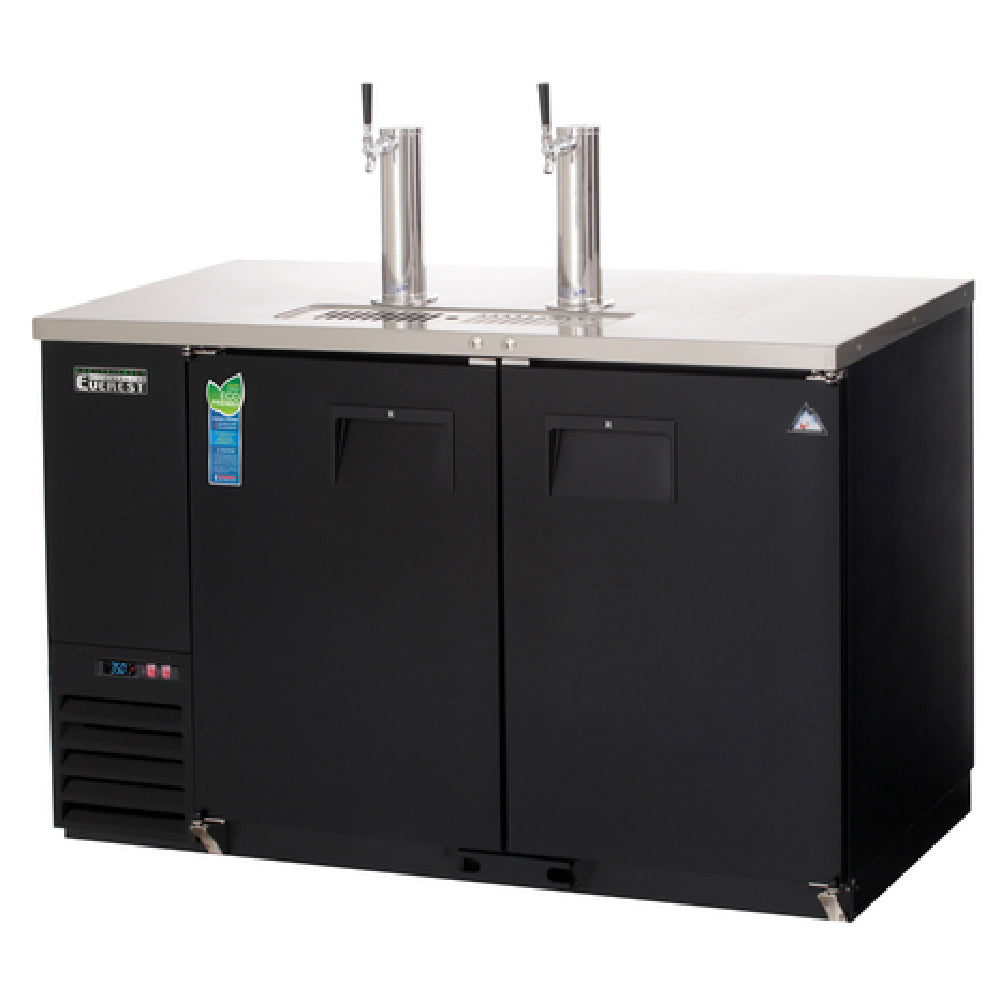 Everest Refrigeration, EBD2-24, Direct Draw Keg Refrigerator, two-section, 57-3/4"W, 17.0 cu. ft. capacity, self-contained side mounted refrigeration, (2) solid hinged doors (locking), holds (2) 1/2 barrel kegs, (2) 3" diameter insulated stainless steel draft towers (NSF) with air distributor, (1) faucet per tower, stainless steel countertop, digital controls with LED display, auto defrost, LED interior lighting, textured & laminated black vinyl exterior, galvanized steel interior wall & stainless steel floor, exterior drain port for excess top tray moisture, drain hose not included, floor drain required, R290 Hydrocarbon refrigerant, 1/4 HP, 115v/60/1-ph, 3.5 amps, cord, NEMA 5-15P, NSF, cETLus, ETL-Sanitation
